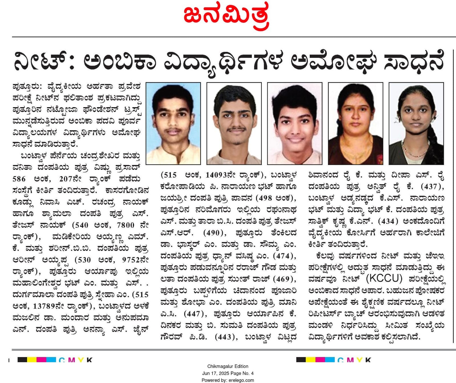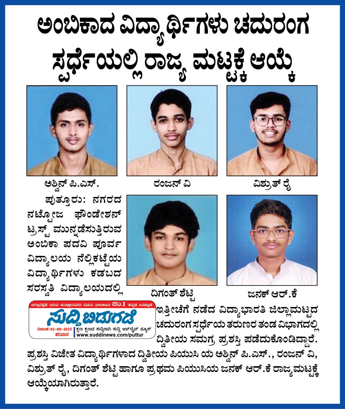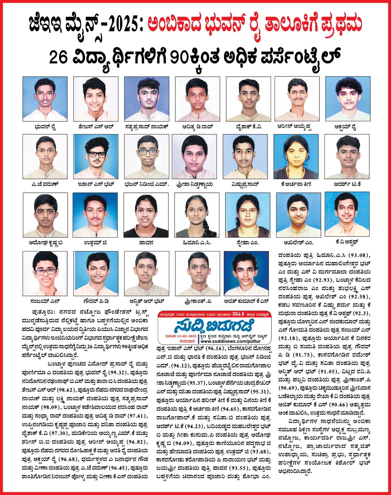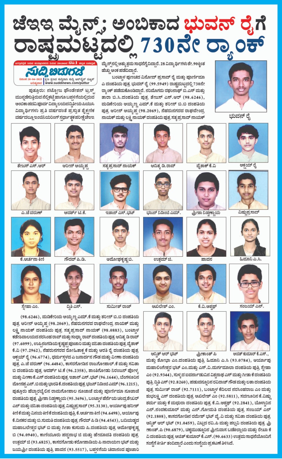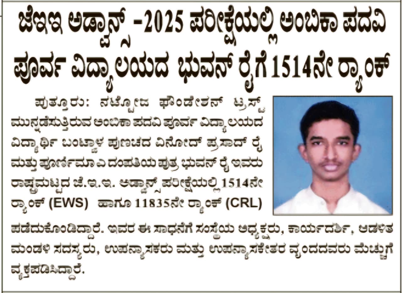ಜೆಇಇ ಮೈನ್ಸ್ 2025 - ಅಂಬಿಕಾದ ಭುವನ್ ರೈ ತಾಲೂಕಿಗೆ ಪ್ರಥಮ  Click Here