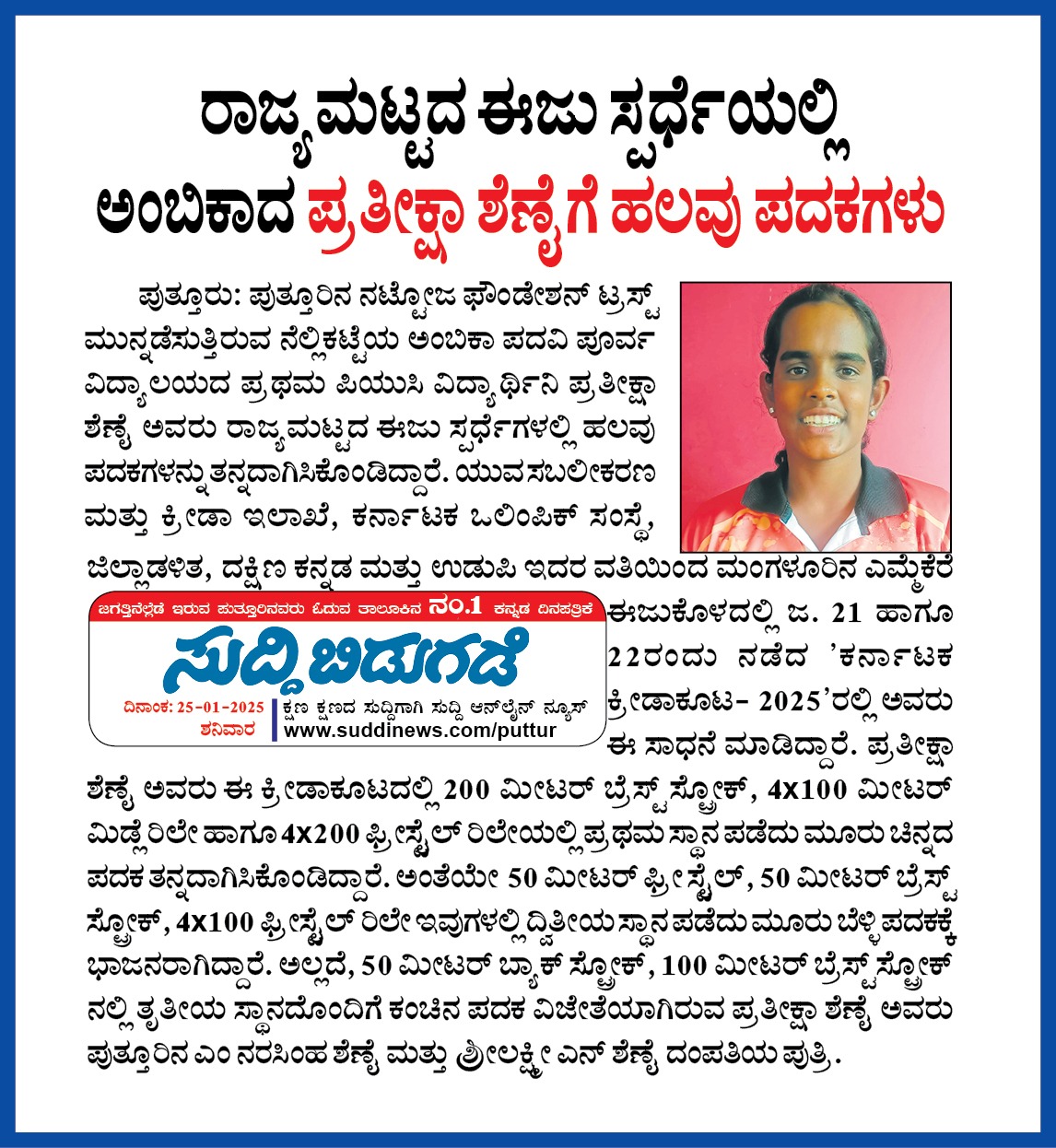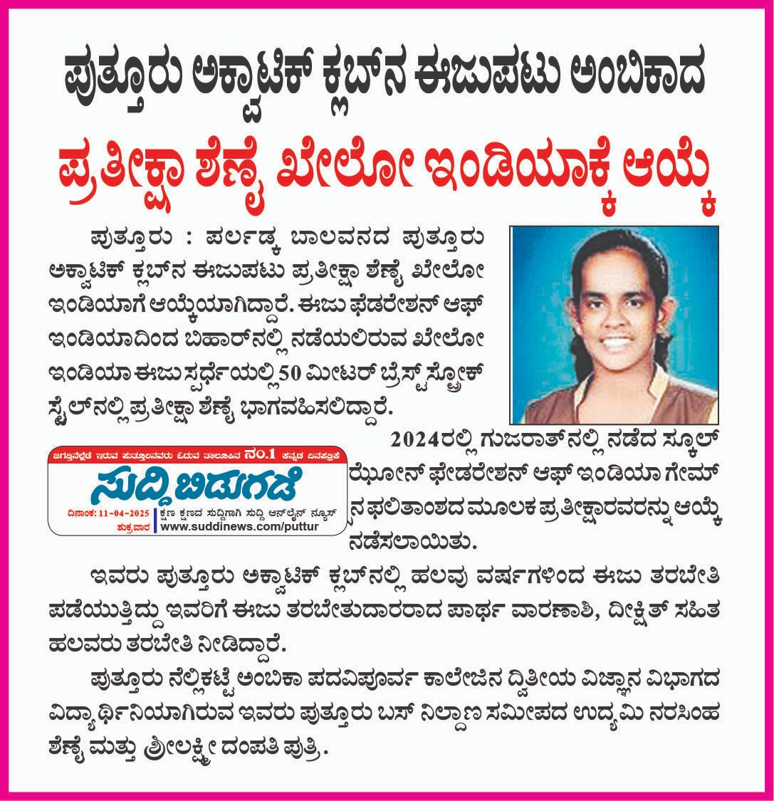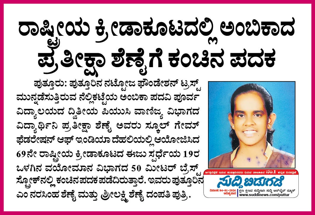 ರಾಷ್ಟ್ರೀಯ ಕ್ರೀಡಾಕೂಟದಲ್ಲಿ ಅಂಬಿಕಾದ ಪ್ರತೀಕ್ಷಾ ಶೆಣೈಗೆ ಕಂಚಿನ ಪದಕ Click Here