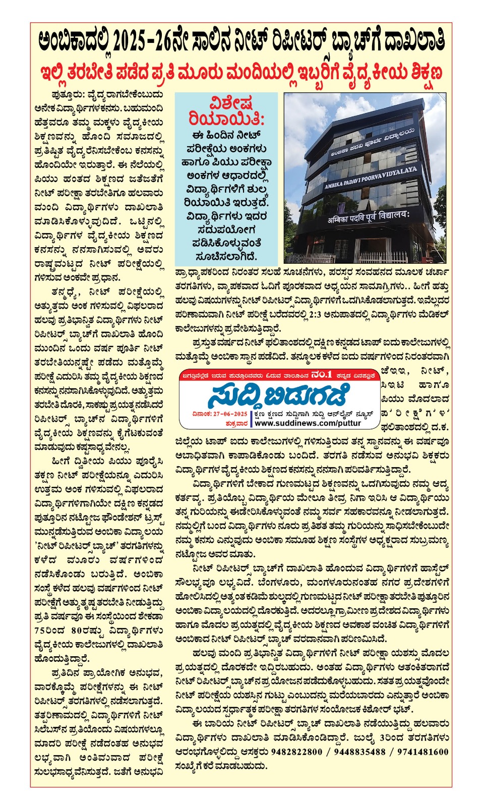 Ambika Padavi Poorva Vidyalaya Ramakrishna Ashram Road, Nellikatte, Puttur - Dakshina Kannada, Karnataka - 574201.