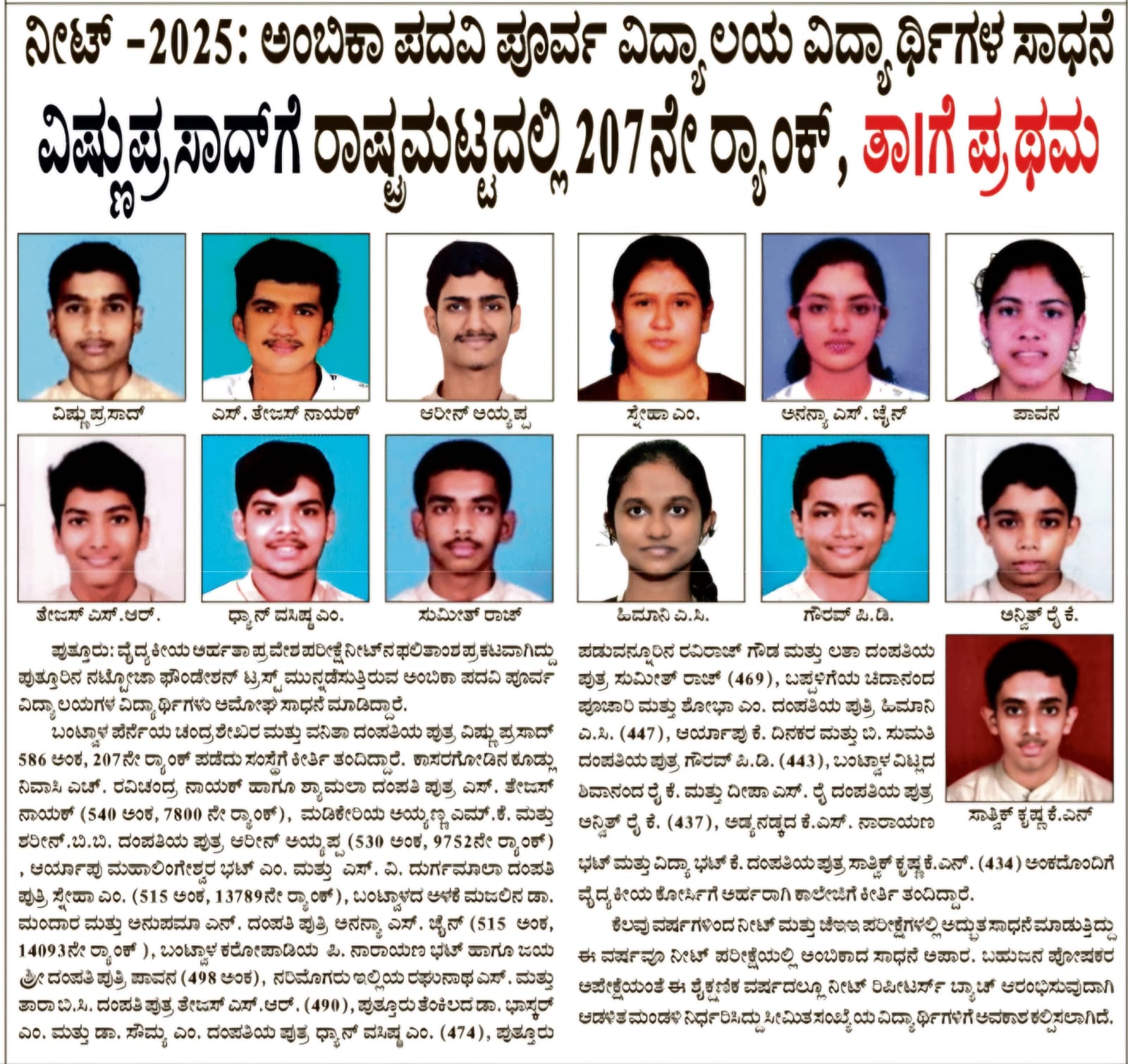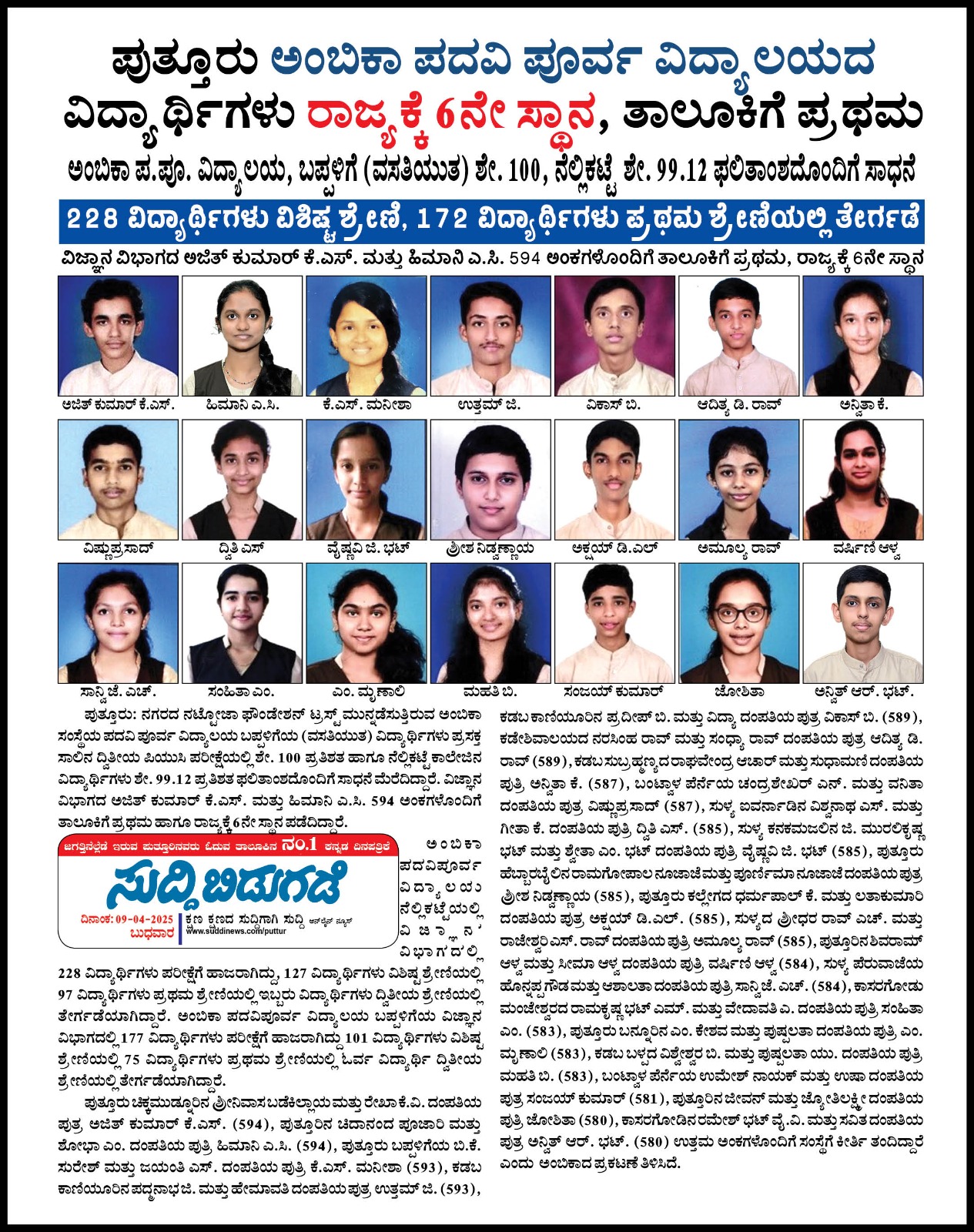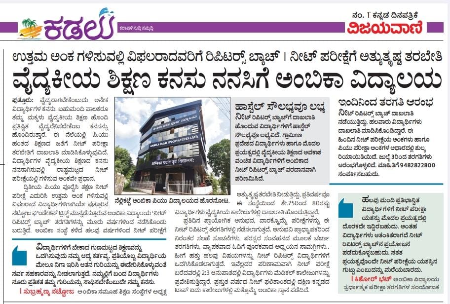 ದ್ವಿತೀಯ ಪಿಯುಸಿ ಫಲಿತಾಂಶ: ಪುತ್ತೂರು ಅಂಬಿಕಾ ಪದವಿ ಪೂರ್ವ ವಿದ್ಯಾಲಯ ವಿದ್ಯಾರ್ಥಿಗಳು ರಾಜ್ಯಕ್ಕೆ 6ನೇ ಸ್ಥಾನ, ತಾಲೂಕಿಗೆ ಪ್ರಥಮ  Click Here