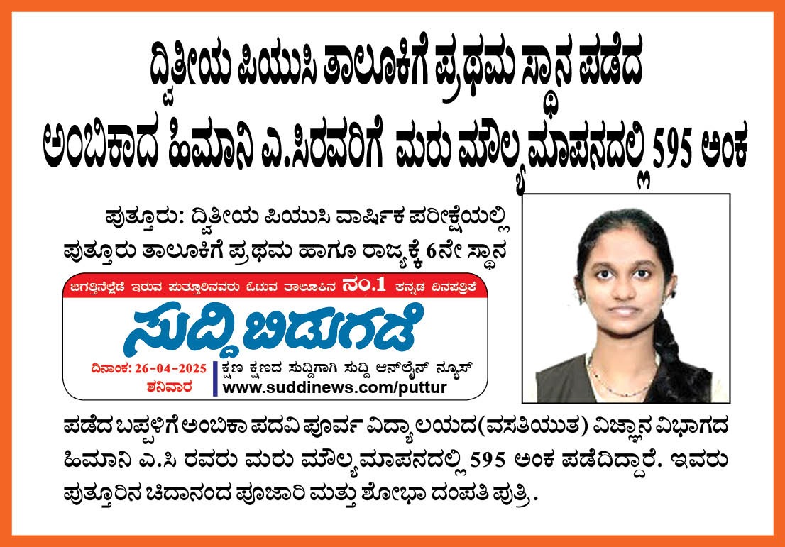 ದ್ವಿತೀಯ ಪಿಯುಸಿ ಪರೀಕ್ಷೆ ಫಲಿತಾಂಶ ಪ್ರಕಟ : ಪುತ್ತೂರು ತಾಲೂಕಿಗೆ ಅಂಬಿಕಾ ವಿದ್ಯಾಸಂಸ್ಧೆಯ ಹಿಮಾನಿ ಟಾಪರ್  Click Here