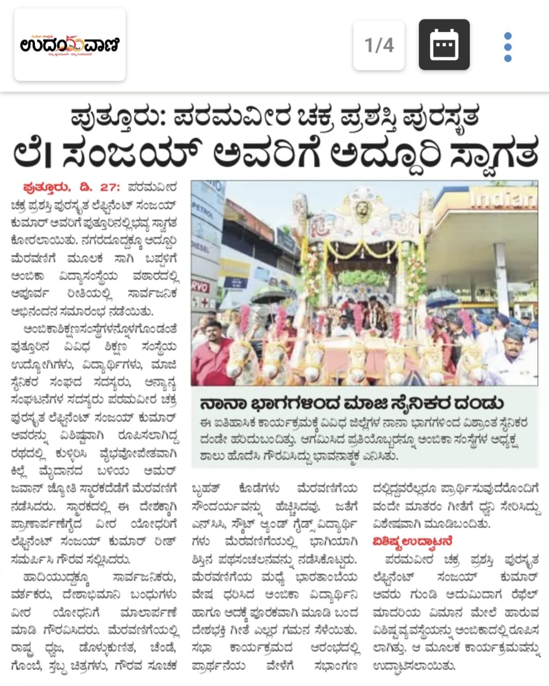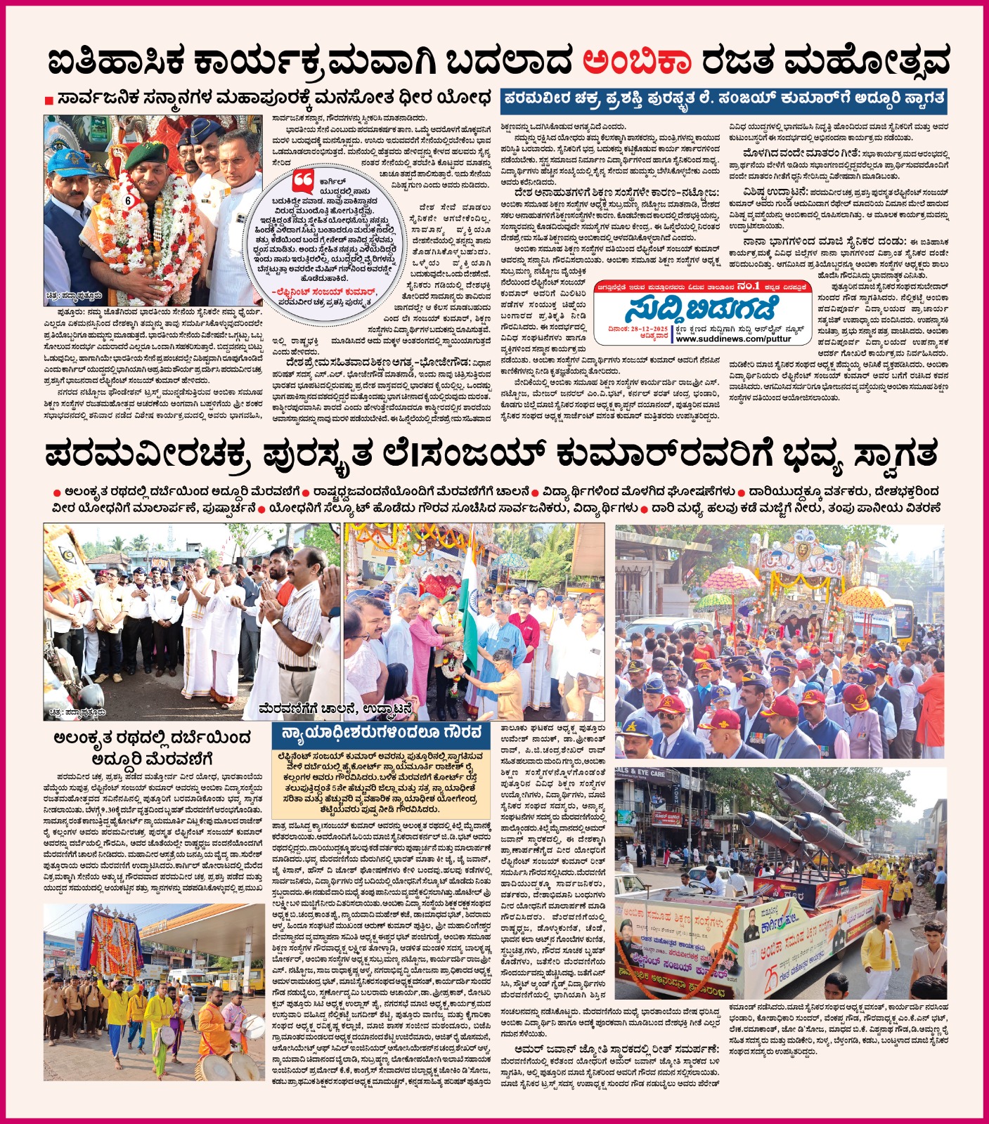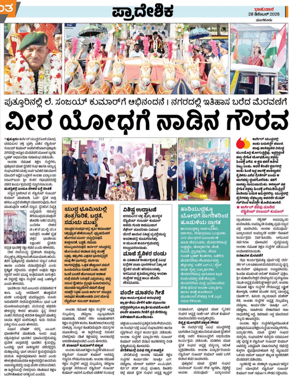 ಕಾರ್ಗಿಲ್ ವೀರ, ಪರಮವೀರಚಕ್ರ ಪುರಸ್ಕೃತ ಲೆಫ್ಟಿನೆಂಟ್ ಸಂಜಯ್ ಕುಮಾರ್ ಪುತ್ತೂರಿಗೆ ವೈಭವದ ಸ್ವಾಗತ Click Here